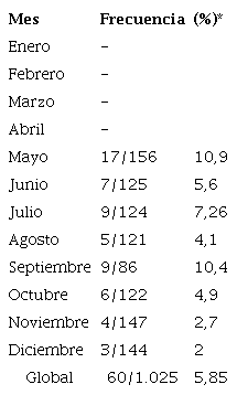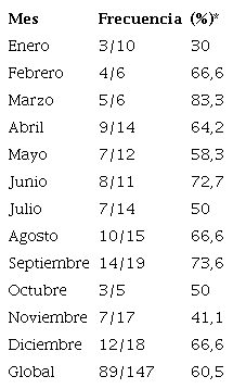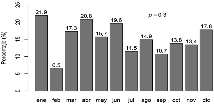 Finalmente, se encontró una tendencia a la disminución de la prevalencia de E. coli productora de BLEE durante el periodo de estudio: pasando del 21,9 en ene-ro al 17,8 % en diciembre, aunque sin alcanzar una diferencia estadísticamente significativa (p = 0,3) (Figura 2).