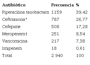 Durante el periodo de estudio, se registraron 10.172 prescripciones de los antibióticos seleccionados. De este número, el 30,67 % (3.120), 28,9 % (2.940), 13,72 % (1.396) y 10,2 % (1.038) fueron realizadas por internistas, médicos generales, cirujanos y pediatras, respectivamente. El resto de las formulaciones correspondieron a otras especialidades (16,5 %). La Tabla 1 muestra las proporciones según los antibióticos prescritos por medicina general. Los antibacterianos seleccionados para la auditoria, predominantemente ordenados, fueron piperacilina tazobactam, ceftriaxona y cefepime. Otros como meropenem, vancomicina e imipenem tuvieron una baja frecuencia de prescripción por este grupo de profesionales.
