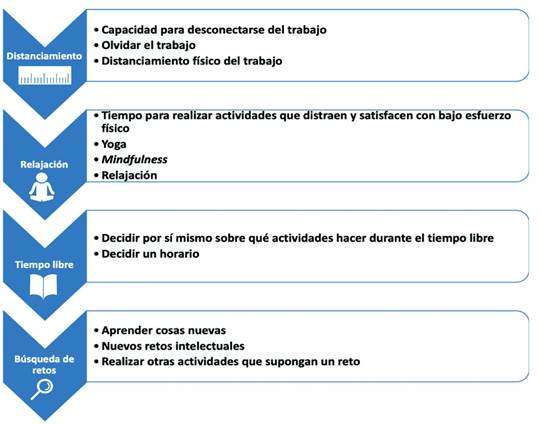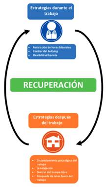 Métodos: basados en el marco teórico de la psicología organizacional positiva, en esta revisión narrativa sintetizamos la evidencia proveniente de estudios originales publicados entre 2010-2019, respecto a cuatro estrategias de recuperación: 1. El distanciamiento psicológico del trabajo; 2. La relajación: 3. Control del tiempo libre; y 4. Búsqueda de retos fuera del trabajo.