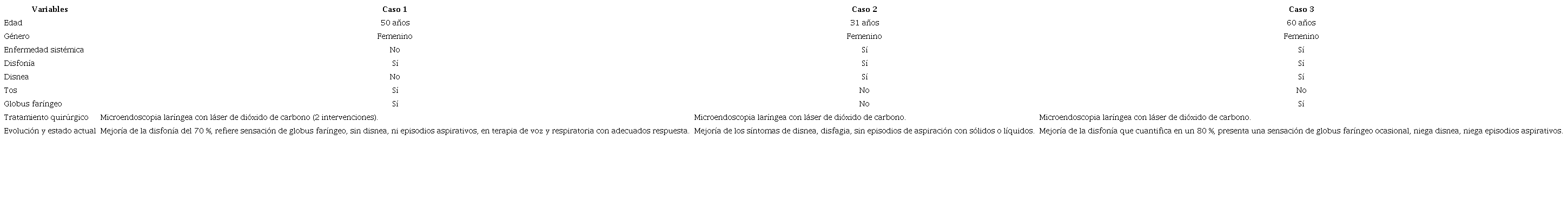 Caso 3. Actualmente, la paciente no ha presentado progresión de las lesiones con mejoría de la disfonía en un 80 %. Sensación de globus faríngeo ocasional, sin disnea o episodios de aspiración. Continúa en seguimiento por otorrinolaringología.