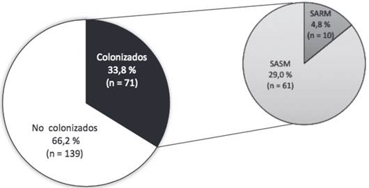 Resultados: se incluyeron 210 pacientes, de estos el 50,5 % (n = 106) fueron mujeres, con una mediana para la edad de 62 años (RIC 51,87-71,13). De las características clínicas se destacó el uso frecuente de antibióticos: 59 % (n = 124) y la historia de hospitalización: 69 % (n = 145). El porcentaje de colonización por S. aureus fue de 33,8 % (n = 71) y el sitio más frecuente de colonización fue las fosas nasales (19 %; n = 40). Todos los aislados fueron sensibles a la mupirocina por el método de VITEK-2. Sin embargo, un aislado presentó resistencia de bajo nivel a la mupirocina por E-test. La colonización por aislados resistentes a meticilina (SARM) fue de 4,8 % (n = 10) y estos presentaron, principalmente, resistencia solamente a la oxacilina (58,3 %; n = 7).