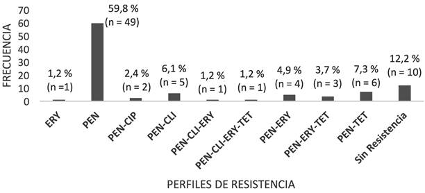 La colonización por aislados resistentes a la meticilina (SARM) fue de 4,8 % (n = 10)(Figura 1). Adicionalmente,dos de los pacientes estaban colonizados simultáneamente en las fosas nasales y en la piel, para un total de 12 cepas de SARM.En cuanto al perfil de resistencia, los aislados de SARM presentaron principalmente resistencia solo a la oxacilina: 58,3 % (n = 7), seguido por la resistencia simultánea a la oxacilina + eritromicina + tetraciclina: 25 % (n = 3) y por el perfil de resistencia a oxacilina + eritromicina + clindamicina + tetraciclina: 16,7 % (n = 2). Por su parte, el perfil más frecuente en los aislados sensibles a la meticilina (SASM) fue la resistencia solo a la penicilina: 59,8 % (n = 49), seguido por la resistencia simultánea a la penicilina + tetraciclina: 7,3 % (n = 6)(Figura 2). El aislado con resistencia de bajo nivel a la mupirocina fue resistente solo a la oxacilina.
