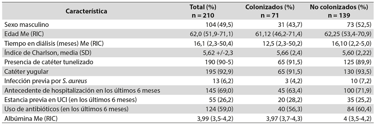 Se incluyeron 210 pacientes, de estos el 50,5 % (n = 106) fueron mujeres y la mediana para la edad fue de 62 años (RIC 51,87-71,13). De las características clínicas se destacó el uso frecuente de antibióticos: 59 % (n = 124), historia de hospitalización: 69 % (n = 145), índice de Charlson con una media de 5,6 (DE: 2,3) y estancia previa en unidad de cuidado intensivo 26,2 % (n = 55) (Tabla 1). El porcentaje de colonización por S. aureusfue de 33,8 % (n = 71) (Figura 1). La colonización más frecuente se observó en las fosas nasales: 19 % (n = 40), seguida por la presencia simultánea en piel y las fosas nasales: 10,9 % (n = 23) y, solo en la piel: 3,8 % (n = 8). La comparación de características clínicas mostró que el tiempo en la diálisis fue inferior en los pacientes colonizados, en comparación con los no colonizados, con una diferencia de 4 meses (Tabla 1).