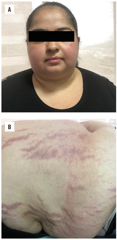 Los signos y síntomas son muy similares al SC endógeno (Figura 1). Los más comunes son la obesidad centrípeta, la cara de luna llena, el aumento de la grasa supraclavicular, las alteraciones en el periodo menstrual (oligo/amenorrea) y en la libido, la hipertensión, fragilidad capilar (equimosis espontáneas), debilidad muscular proximal, hirsutismo, letargia y depresión, presencia de giba, atrofia cutánea, estrías pigmentadas mayores a 1 cm de grosor en los flancos o en otras superficies del cuerpo. También se describen patologías como aterosclerosis, prediabetes o diabetes, osteoporosis, hipercoagulabilidad, infecciones recurrentes, cefalea, entre otros 1. Muchos de los síntomas se pueden presentar aun con dosis bajas de estos medicamentos (< 7,5 mg/día de prednisolona o su equivalente) 19.