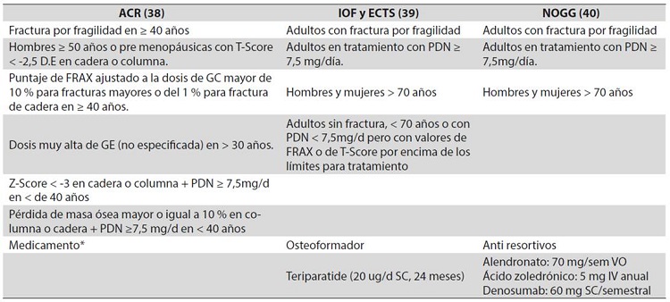 Para el manejo se sugiere usar la mínima dosis posible de GE, asociándolos con terapias ahorradoras de esteroides, usándolos por otras vías o cambiándolos por otros de menor potencia 19,36; se deben descartar otras causas secundarias de la osteoporosis. Se debe evitar el consumo de cigarrillo y licor, promover la actividad física regular y tener una adecuada ingesta de calcio (1.000 mg/día), mantener unos niveles de vitamina D3 mayores a 30 ng/ml (suplemento de 600 a 800 UI/día) y evaluar y corregir los factores que aumentan el riesgo de caídas 19,29,36,38. Las recomendaciones para el tratamiento farmacológico de la osteoporosis inducida por GC de acuerdo con las diferentes guías se presentan en la Tabla 338-40.