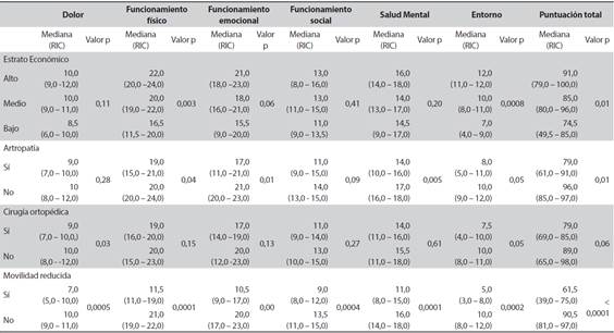 Aquellos con estrato socioeconómico bajo tuvieron una menor puntuación en los dominios del funcionamiento físico y, en el entorno, aquellos de estratos altos y medio. La artropatía se asoció con un menor puntaje en los dominios del funcionamiento emocional, la salud mental y del entorno. Por último, está la cirugía ortopédica con puntajes más bajos en el dominio dolor (Tablas 3 y 4).
