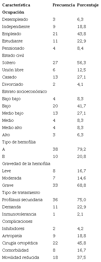 Results: Forty-eight adults were included, with a median age of 32 years old (RI: 23.2-40.7). The population varied in the severity of hemophilia (16.7% mild, 12.5% moderate, and 70.8% severe) and in treatment (75% prophylaxis, 22.9% demand and 2.1% immuno-tolerance.), 37.5% had reduced mobility, while 16.7% suffered from comorbidity. The total Hemolatin-Qol score was 81.5. The factors associated with lower quality of life were: older age, number of comorbidities, low socioeconomic level, presence of arthropathy and reduced mobility.
