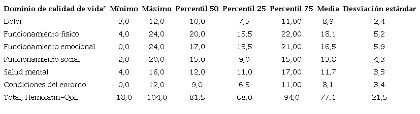 El Hemolatin-QoL es un instrumento específico para la hemofilia en la población adulta latinoamericana. Fue desarrollado y validado por los autores simultáneamente en varios países: Colombia, Cuba, Chile, Nicaragua, Argentina, Brasil, Panamá, Venezuela y Uruguay (13). Tiene 27 ítems con opciones de respuesta adjetivales entre 0 y 4.