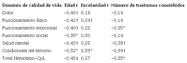 Específicamente por dominios, la edad se relacionó con todos ellos al igual que la movilidad reducida: a mayor edad menor la CVRS y en presencia de movilidad reducida, más baja CVRS. La escolaridad se correlacionó positivamente con el funcionamiento físico y las condiciones del entorno. El número de trastornos comórbidos se correlacionó negativamente con los dominios del funcionamiento emocional, la salud mental y las condiciones del entorno.