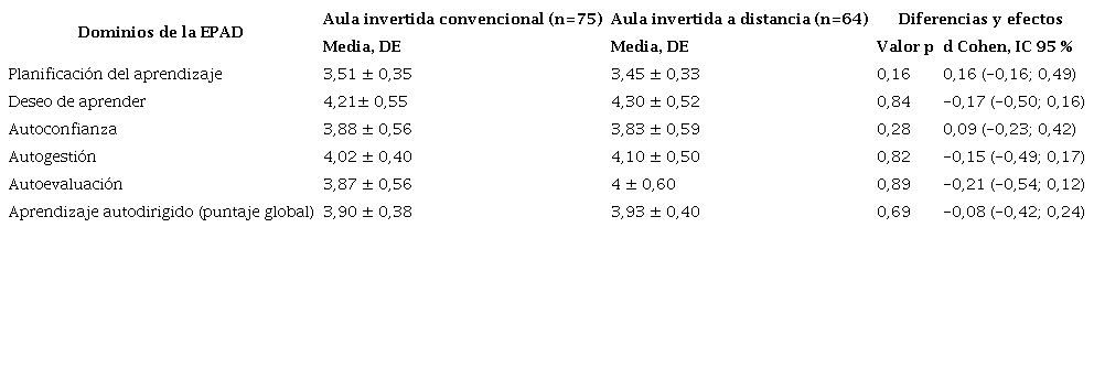 Un total de 64 estudiantes participaron en el AID (tasa de respuesta del 100 %). La edad promedio de los participantes fue 22,03 ± 1,51 años (65,6 % del género femenino). El Alfa de Cronbach de la EPAD fue de 0,92. El puntaje global de la EPAD de los participantes en el AID fue de 3,94 ± 0,40 (2,76 - 4,72). El puntaje global de la EPAD de los participantes en el AIC (2017) fue de 3,90 ± 0,38 (2,82 - 4,65). No identificamos diferencias significativas entre los puntajes de los dos grupos de participantes. Igualmente, no percibimos un efecto importante en ninguno de los dos modelos sobre el aprendizaje autodirigido (d = -0,08; IC 95 % -0,42;0,24). Los resultados por cada dominio de la EPAD entre los dos grupos de participantes no demostraron diferencias significativas ni efectos importantes a favor de ninguno de los modelos (Tabla 1).
