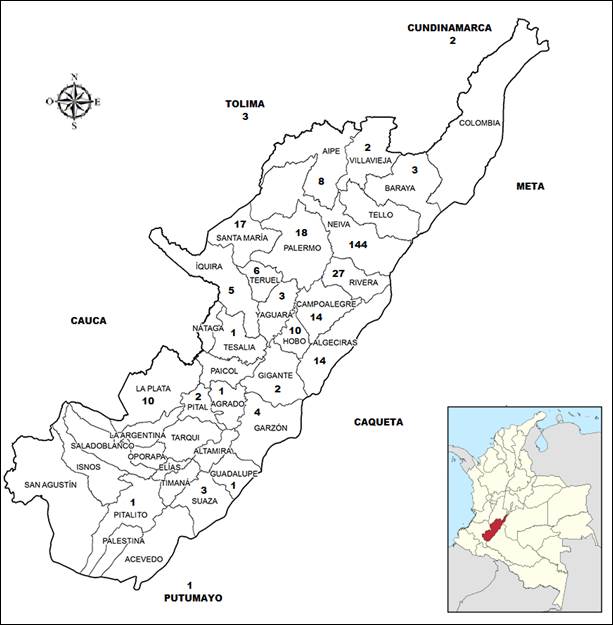 El departamento Huila está conformado por 37 municipios y cuenta con varios centros de salud de mediana complejidad en Pitalito, La Plata, Garzón, Gigante y Neiva. El HUHMP es un cetro de alta complejidad ubicado en Neiva, recibe remisiones de todo el departamento y también del sur del país. Entre el 2014 y 2018 la mayoría de los casos de escorpionismo atendidos en la institución se originaron en los municipios Neiva (47 %), Rivera (9 %) y Palermo (6 %), con un pequeño porcentaje de casos (3 %) provenientes de otros departamentos (Figura 1).