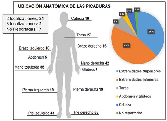 La mayoría de los eventos se presentaron en horario diurno (76 %), en horas de la mañana principalmente (36 %), con predominio de picaduras localizadas en las extremidades inferiores (42 %) y superiores (35 %). El total fue de 323 picaduras: 275 con localización única, 21 casos con 2 localizaciones, 2 casos con 3 localizaciones y 7 eventos en donde la localización no fue registrada (Figura 2).
