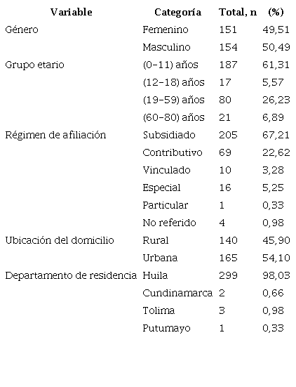Del total de los casos analizados la mayoría eran personas jóvenes, con una edad media de 17 años, el mayor porcentaje de eventos se presentó en el grupo de edad entre los 0 y 11 años (61 %), seguido por el grupo de 19 a 59 años (27 %). Los pacientes pertenecían principalmente al régimen de seguridad social subsidiado (67 %) y casi la totalidad de los casos residían en el departamento Huila (98 %), más de la mitad en el área urbana (54 %) (Tabla 1).