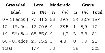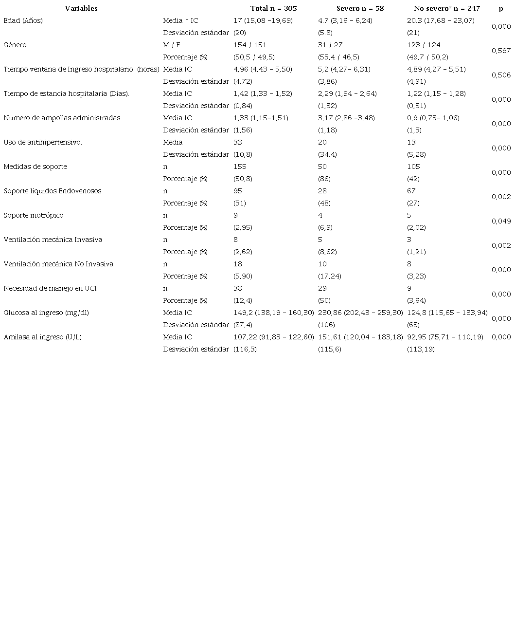 Se encontró que la edad está inversamente relacionada con la gravedad del cuadro clínico, ya que fue la población pediátrica (media de 4,7 años) la que presentó mayor número de casos graves de escorpiotoxicosis. Adicionalmente, fue hallada una relación estadísticamente significativa (p < 0,05) entre la clasificación de un caso grave y la utilización de un número mayor de ampollas de antiveneno (3 veces más), soporte hídrico e inotrópico más frecuente, al igual que el uso de un antihipertensivo, en compa-ración con los casos no graves. De igual forma, el ingreso a la unidad de cuidado intensivo (UCI) y la alteración en los parámetros de laboratorio, como la hiperglicemia e hiperamilasemia fueron significativamente más frecuentes en este grupo de pacientes (Tabla 4).