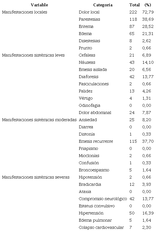 Los síntomas locales más frecuentes fueron el dolor localizado (72 %), seguido de parestesias (38 %) y eritema (28 %); los sistémicos leves más frecuentes fueron las náuseas (14 %), la diaforesis (13 %) y la cefalea (6,8 %), la manifestación sistémica moderada más común fue la emesis recurrente (37 %) y de los hallazgos sistémicos graves, la hipertensión (16 %) y el compromiso neurológico (13 %) fueron los más prevalentes (Tabla 3). Debido al diseño del estudio y la manera en la que se recolectaron los datos, no fue posible la identificación taxonómica de los animales involucrados en los casos de escorpiotoxicosis aquí reportados.