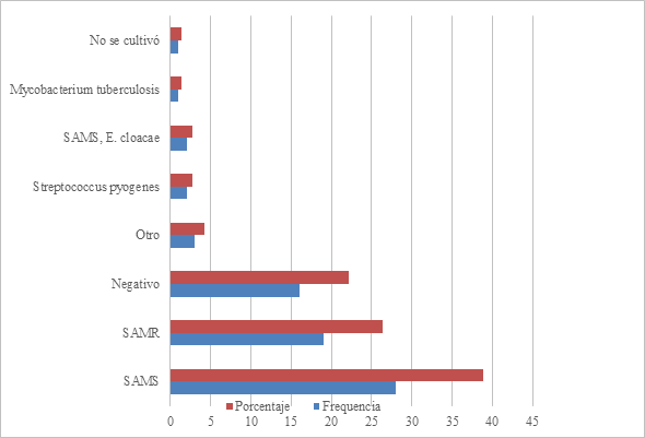 Solo a un paciente en el estudio no se le tomaron muestras para el cultivo, su infección se trató solamente con antibióticos de manera empírica con una buena evolución clínica. A los otros 71 (98,6 %) se les tomaron muestras de tejido blando o de hueso (según el tipo de infección) para el cultivo en procedimiento quirúrgico con todas las normas de asepsia quirúrgica; el microorganismo más común fue el SAMS en el 38,9 % de los pacientes, lo que concuerda con la literatura mundial al ser el agente más frecuente en este tipo de infecciones, seguido por las cepas meticilino-resistente 26,4 % (1,6-9,11,13). Los cultivos negativos fueron el 22 %, una cifra mucho menor que lo reportado en estudios previos, en los que se reportaron cultivos positivos del 18 al 40 % (1,6,9,11).