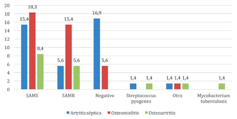 Por tipo de infección encontramos que el SAMS tiene una distribución muy similar en la artritis y osteomielitis, el SAMR es más común en la osteomielitis. Esto es diferente a lo reportado por Arnold (2), que encontró que tanto el SAMS como el SAMR fueron mucho más comunes en la osteomielitis; en la artritis séptica se cultivaron más bacilos gram negativos, que no encontramos en nuestro estudio. En cuanto a la osteoartritis hallamos el 100 % de positividad en los cultivos, lo que sugiere un aumento en la sensibilidad de los cultivos en la presencia de doble compromiso óseo y articular; con un reporte similar por Arnold (2) que encontró positivos más del 80 % en osteoartritis.
