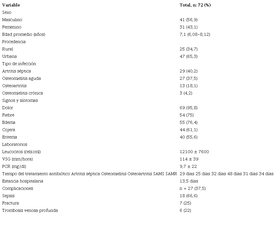 Resultados: identificamos 72 pacientes con infección osteoarticular. La infección más común fue la artritis séptica (40 %), seguida por la osteomielitis aguda (37 %). La cadera (18 %) y la tibia (31 %) fueron la articulación y el hueso afectados con mayor frecuencia. La mayoría de las infecciones fueron secundarias a S. aureus (65 %), de estas fueron por Stafilococo aureus meticilino sensible (SAMS) el 38,9 % y por Stafilococo aureus meticilino resistente (SAMR)el 26,4 %. El tratamiento antibiótico empírico y el tratamiento definitivo se basó en cefalosporinas de primera generación en 83 % y 52,7% de los casos, respectivamente. La principal complicación fue la sepsis en 18 (25 %) pacientes.
