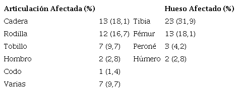 La artritis séptica fue más frecuente en la cadera y la rodilla con un 18,1 % y 16,7 %, respectivamente. Los huesos más afectados por la osteomielitis fueron la tibia con un 31,9 % y el fémur en un 18,1 % (Tabla 2).