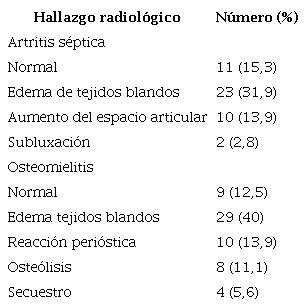 Los signos y síntomas presentados por nuestros pacientes concuerdan con los reportados en la literatura disponible (6-8,11). Llama la atención la pequeña porción de enfermos que no presenta dolor, por lo que no se podría descartar completamente el diagnóstico de infección osteoarticular en ausencia de dolor; al igual que la fiebre, que se mostró en el 75 % de los pacientes; su ausencia tampoco excluye el diagnóstico. El llanto metafisario y el derrame articular no fueron tan frecuentes: 22 % y 19 %, respectivamente. La fístula se presentó en menos del 10 % de los casos, especial-mente en infección avanzada. Los signos y síntoma se presentaron, en promedio, 10 días antes de realizar el diagnóstico (Tabla 1).