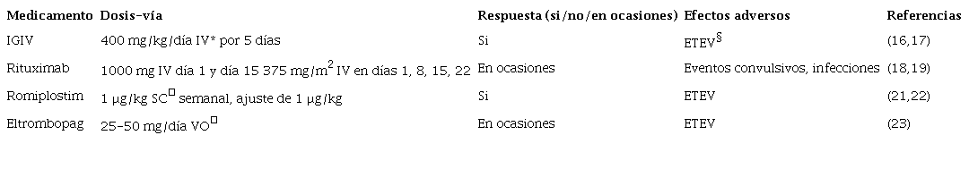 Con relación al tratamiento, dada su fisiopatología similar con la PTI, las recomendaciones se han extrapolado de las guías de manejo de PTI (Tabla 1) (15). El tratamiento de primera línea consiste en glucocorticoides o inmunoglobulina intravenosa (IVIg) con observación estricta, ya que se han descrito fenómenos trombóticos relacionados con esta intervención. Desde la década de 1980 se ha reportado el uso de IVIg para el tratamiento de trombocitopenia en el contexto de SAF (16). Aunque muy pocos estudios han investigado específicamente su seguridad en este contexto, una serie de casos reciente informó sobre nueve pacientes con enfermedad autoinmune que recibieron IVIg y desarrollaron enfermedad tromboembólica, -incluidos dos con SAF secundario- (17).