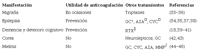 Por otro lado, el compromiso neurológicas ha sido descrito desde el pasado siglo, cuando apenas se empezaba a conformar el SAF como una entidad. Aquellas abarcan manifestaciones leves desde la cefalea hasta otras más graves como la mielitis. Cabe resaltar que muchas de estas tienen un origen no trombótico, por lo que la conducta que requieren será diferente a la anticoagulación y ha de incluir la inmunomodulación.