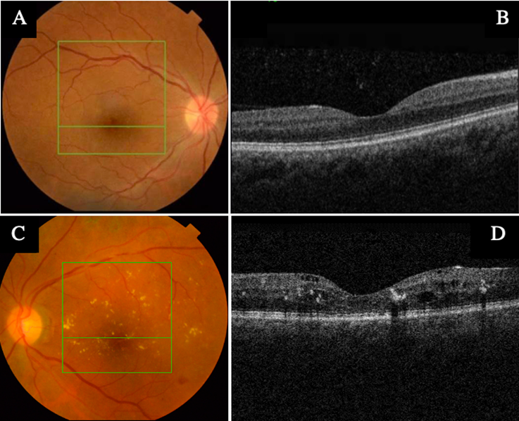 Dentro de los 3 pacientes que no se les encontró EMD por OCT, se asume que la presencia de drusas perimaculares pudo haber sido confundida por exudados duros del EMD (Figura 1); para diferenciar estas dos entidades es muy útil analizar la OCT, en la cual podemos ver que los exudados duros están localizados de forma intraretinal, mientras que las drusas se encuentran en el epitelio pigmentario. Además, se les realizó una nueva fundoscopia por un especialista de retina y se encontró que el brillo de la limitante interna pudo ser otro factor de confusión en el examen clínico del tamizaje, especialmente en los pacientes más jóvenes.
