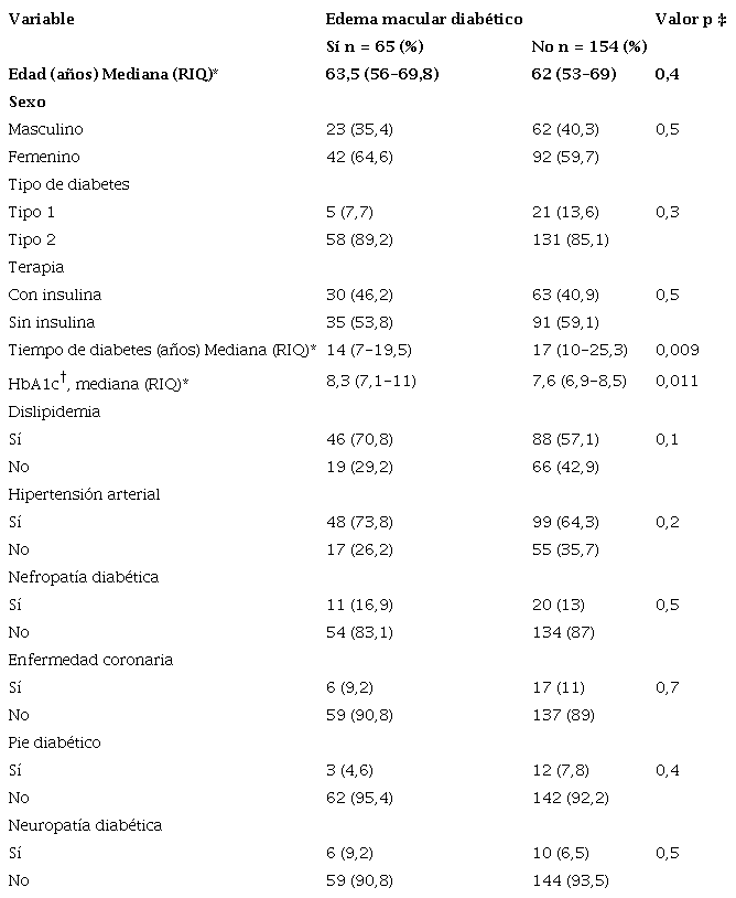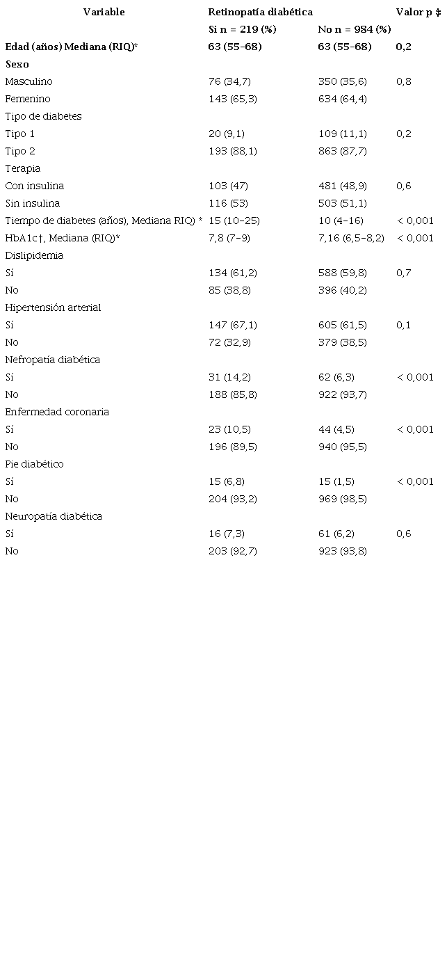 La mediana de la edad del grupo de los pacientes con RD fue de 63 años (rango intercuartílico [RIQ] 55-68), el 65 % fueron mujeres, el 47 % de los pacientes estaban en tratamiento con insulina mientras que el otro 53 % recibían terapia con hipoglicemiantes orales y dieta. El tiempo de evolución de la diabetes tuvo una mediana de 15 años (RIQ 10-25), siendo significativamente mayor al compararla con los que no tenían RD (10 años, RIQ 4-16, p = <0,001). La media de HbA1c fue de 7,8 (RIQ 7-9), mientras que en los pacientes sin RD fue de 7,2 (RIQ 6,5-8,2; p=<0,001). La dislipidemia y la HTA fueron las comorbilidades más frecuentes en este grupo, con frecuencias de 61,2 % y 67,1 %, respectivamente (Tabla 1).