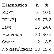 Encontramos que el 10,8 % (7) tenía RDP y el 73,8 % RDNP (48), de los cuales, el 24,6 % (16) correspondía a RDNP leve; 30,7 % (20) moderada y, 18,5 % (12) grave. El otro 15,4 % (10) no fue registrado (Tabla 3). En un 93,8 % (61) de los casos se hizo un diagnóstico de novo de EMD.