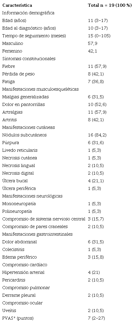 Once pacientes fueron de sexo masculino (57,9 %) y 8 de sexo femenino (42,1 %), con una relación varón-mujer de 1,38:1. La mediana de la edad al momento del diagnóstico fue de 10 años (rango de 3-17 años). Diez niños fueron diagnosticados de novo, mientras que 9 presentaron recaída. El período del seguimiento promedio fue de 15 meses (rango de 0-105 meses). Once presentaron PANC (58 %) y 8 PANS (42 %). Toda la población incluida tenía antecedente de vacunación contra la hepatitis B. Las manifestaciones clínicas más comunes fueron los nódulos subcutáneos, fiebre, artralgias y dolor en las pantorrillas. Con respecto a las otras manifestaciones sistémicas, las más frecuentes fueron el dolor abdominal, la hipertensión arterial y el compromiso del sistema nervioso central.