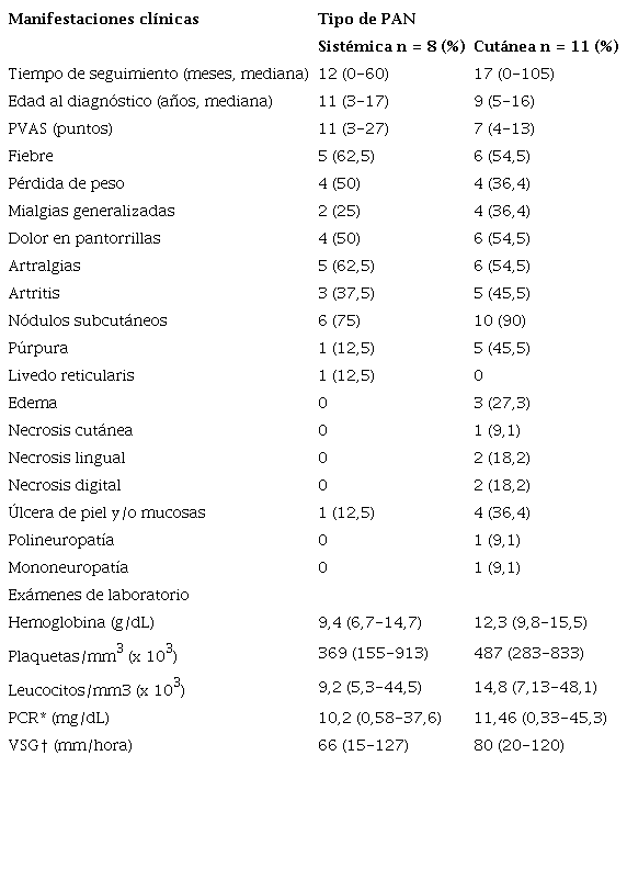 Results: The clinical registries from patients under 18th years with vasculitis or PAN diagnosis attended between 2010 and 2019 in two Medical Centers from Medellín were obtained. Nineteen patients were included: eleven classified as cutaneous PAN (PANC) according to the definition of the European League Against Rheumatism and the European Society of Pediatric Rheumatology and eight as systemic PAN according to Ankara 2008 Criteria. 57.9% were male. The median age at diagnosis was ten years (3-17), and the median follow-up period was 15 months (0-105). The most common clinical characteristics were subcutaneous nodules (84.2%), fever (57.9%), arthralgias (57.9%), and calf pain (52.6%). SPAN patients had more frequent weight loss and lower hemoglobin. Five patients had ulcers (26.3%), four of them with CPAN; two patients had lingual necrosis (10.5%), and two digital necrosis (10.5%), all of them also with CPAN. CRP mean was 10.2 mg/dl (0.33-45.3) and mean erythrocyte sedimentation rate (ESR) was 74 mm/h (15-127 mm/h). Meningeal enhancing, intrahepatic, and mesenteric aneurism, among others, were reported in diagnostic images. All patients required treatment with systemic glucocorticoid. None of the patients died during the follow-up period.