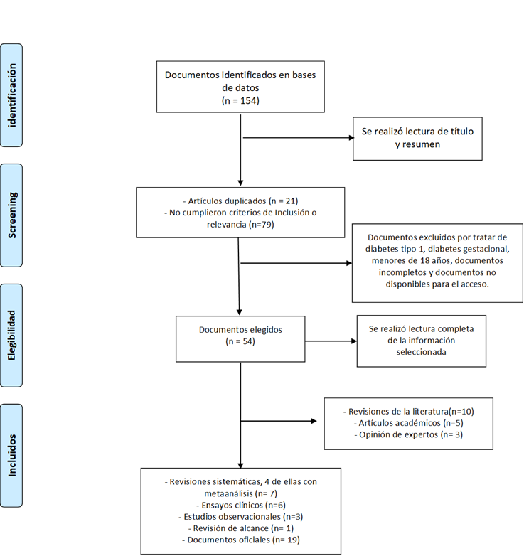 Los criterios de inclusión fueron que debían estar publicados hasta el 2020: revisiones sistemáticas de la literatura, metaanálisis, ensayos clínicos, documentos oficiales, diabetes tipo 2, población mayor de 18 años y consensos o recomendaciones sobre la temática. Los criterios de exclusión abarcaban los trabajos sobre diabetes tipo 1, diabetes gestacional, menores de 18 años, escritos con resultados incompletos y no disponibles para el acceso.