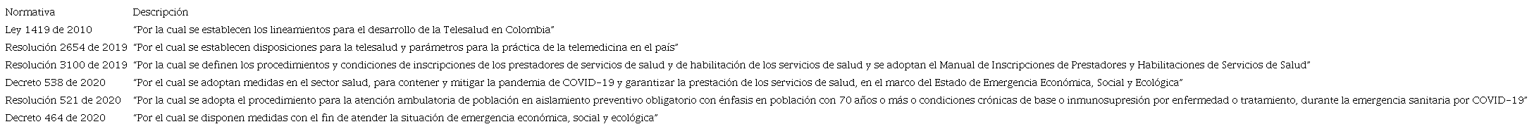 Desde hace décadas Colombia ha legislado sobre la telesalud como un medio importante de atención a la población, en especial para aquella cuya ubicación geográfica, estado social o de vulnerabilidad no permite una atención presencial y constante. En ese sentido, ha habido un compromiso de entes gubernamentales, instituciones educativas públicas y privadas como prestadoras de salud para desarrollar diferentes estrategias para la implementación de la telesalud en el país. Asimismo, durante el estado de pandemia generado por la COVID-19, se presenta como una oportunidad para robustecer este medio de atención a la población.