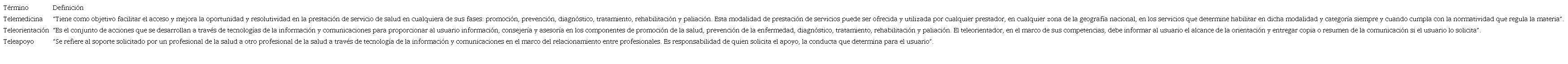 Esta normativa viene gestándose desde hace más de una década, donde el término telesalud es incluido en el Sistema General de Seguridad Social en Salud (SGSSS), como se observa en la Tabla 1 (12). La telesalud engloba actividades relacionados con la actividades, servicios y métodos llevados a través de las TIC a lugares apartados de la geografía colombiana; esta incluye telemedicina, teleeducación, teleapoyo y teleorientación en salud (definiciones descritas en la Tabla 2). Las anteriores se presentan como herramientas para los profesionales de la salud en el cuidado y atención de poblaciones vulnerables (12,13).