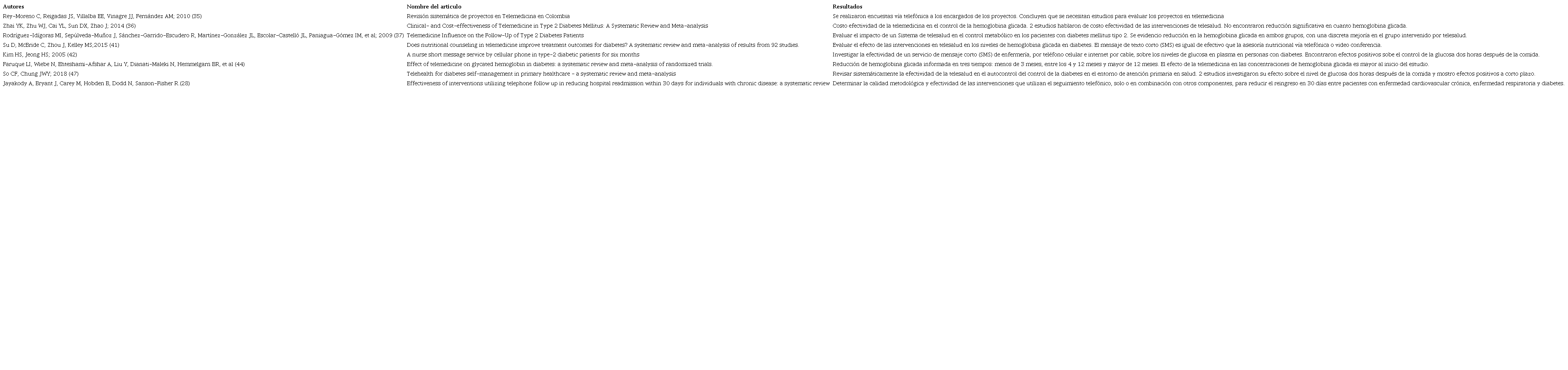 Existen muchas publicaciones científicas (Tabla 3) acerca del papel de la telesalud en el control de la diabetes (revisiones sistemáticas de la literatura, metaanálisis, ensayos clínicos controlados, estudios observacionales, estudios retrospectivos, entre otros), donde se evidencia la efectividad del uso de estas tecnologías para su adecuado control y el descenso de la hemoglobina glicada (42-48).