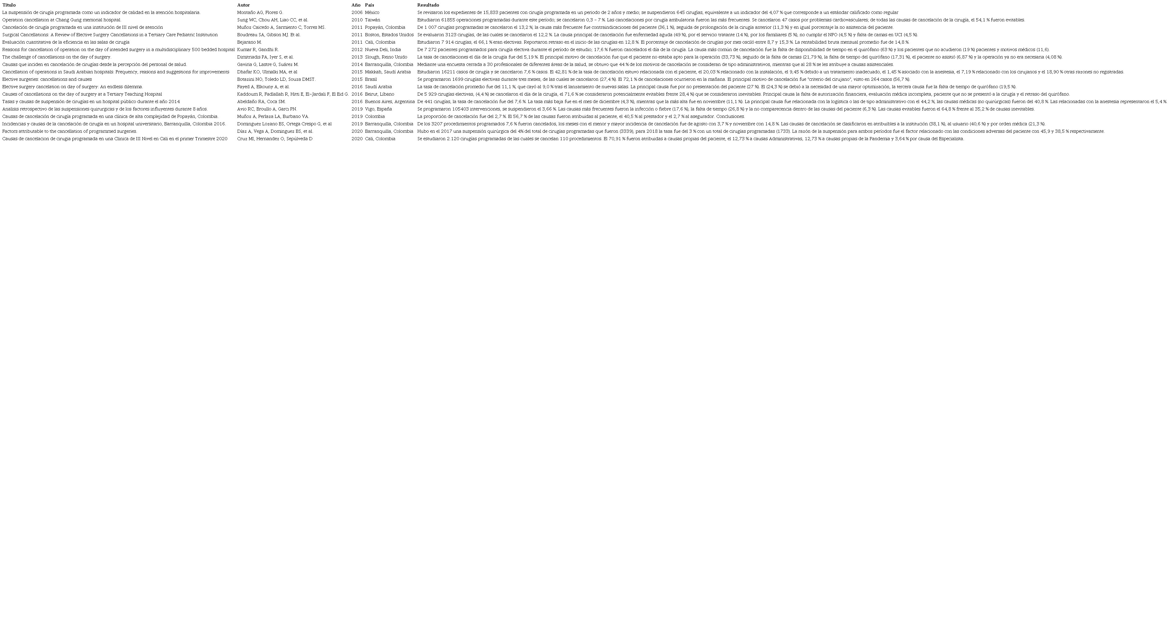 Antes de mencionar la situación actual en Colombia sobre la cancelación de cirugías electivas, es de gran importancia mencionar como se encuentra esta problemática en el mundo y se ha observado que la tasa de cancelación es variable entre diferentes países (Estados Unidos 1,9616,5 %; Pakistán 21 %; India 30,3 %; Reino unido 4 %; España 6,5 %; Hong Kong 7,6 %; Finlandia 4,5 %; Taiwán 0,37 %) (10,13). Las tasas de cancelación en América Latina tienen un comportamiento similar (Argentina 7,6 %; Brasil 27,4 % (3,18). En Colombia varía entre 2,7 7,6 %) (9,19). (Tabla 1.)