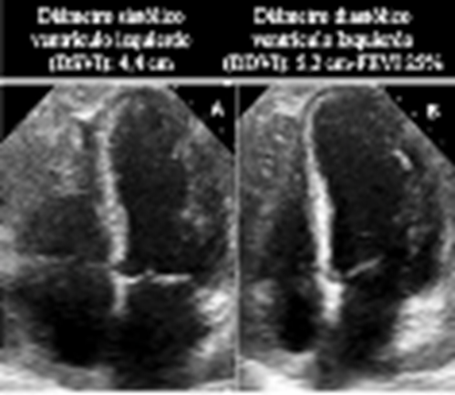 Paciente masculino de 51 años con historia personal de hipertensión arterial (HTA), con diagnostico en el año 2020 de LMA con riesgo citogenético intermedio, por lo que se inició manejo con quimioterapia de inducción con el esquema 7+3 con citarabina-idarrubicina (Citarabina 400 mg cada 24 horas por 7 días e idarrubicina 24 mg cada 24 horas por 3 días) y 3 ciclos de terapia de consolidación con dosis altas de citarabina (Citarabina 5 460 mg intravenosos cada 12 horas los días 1, 3 y 5). Dos semanas posteriores al último ciclo de quimioterapia de consolidación, el paciente consultó por síndrome febril agudo e inestabilidad hemodinámica, el cual fue considerado como choque séptico asociado a neutropenia febril por lo que recibió antibioticoterapia de amplio espectro y soporte vasopresor. Durante la vigilancia en la unidad de cuidados especiales, el paciente refirió dolor torácico intenso, por lo que se realizó un electrocardiograma (ECG) que evidenció elevación difusa del segmento ST en las derivadas DI, DII, aVL, V4, V5, V6 con infradesnivel del ST en V1 y aVR asociado a signo de Spodick, además signos de injuria miocárdica por niveles elevados de troponina I de alta sensibilidad (47 653 ng/L -valor de ref 26,2 ng/L-). Se llevó a coronariografía en la que no se evidenciaron lesiones angiográficamente significativas. Su estado clínico evolucionó a falla orgánica multisistemica con choque séptico y cardiogénico, por lo que se trasladó a cuidados intensivos. La ecocardiografía transtorácica demostró compromiso grave de la fracción de eyección del ventrículo izquierdo (FEVI) del 25 %, dilatación del ventrículo izquierdo, compromiso difuso de la contractilidad y derrame pericárdico leve de 10 mm (Figura 1).