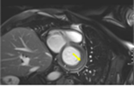 Dado el debut con dolor torácico y el ECG con elevación del ST y signos de pericarditis, sumado a la elevación de biomarcadores, alteraciones de contractilidad y compromiso grave de la FEVI, se sospechó miopericarditis, por lo que se realizó una resonancia magnética simple y contrastada de corazón que reportó edema, hiperemia y realce tardío difuso de distribución no isquémica en las paredes anterior, lateral e inferior (criterios Lake Louise 3/3) del ventrículo izquierdo, además de compromiso del pericardio con engrosamiento y realce basal inferior y derrame pericárdico leve (Figura 2); confirmando así, el diagnóstico de miopericarditis aguda. Se inició manejo con antiinflamatorio no esteroideo (AINE) - Ibuprofeno 400 mg cada 8 horas- y colchicina 0,5 mg/24 horas, para controlar la inflamación y disminuir el riesgo de recurrencias del compromiso pericárdico; además, se inició manejo cardioprotector con enalapril 2,5 mg cada 24 horas y carvedilol 3,125 mg cada 12 horas. Luego de 30 días de hospitalización y previo al egreso, se demostró resolución completa de las alteraciones de la contractilidad y mejoría de la FEVI a 59 %, atribuida al manejo de soporte, suspensión de la quimioterapia, a la resolución de la inflamación sistémica y miocárdica, la suspensión de la ventilación mecánica y el manejo instaurado. Fue dado de alta con los medicamentos anotados previamente y se dejó mínimo 3 meses la colchicina, pues luego de discutir con el grupo de hematología se concluyó que era alta la posibilidad de requerir dosis altas de citarabina en el manejo oncológico ulterior.