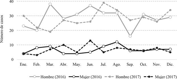 Con respecto a variables temporales, en el 2016 se registró una discreta disminución de los casos de suicidio en hombres en el mes de septiembre; por lo demás, no hay un predominio claro en alguna época del año (Figura 1). En ambos años estudiados, se insinuó una mayor frecuencia de los suicidios los días domingo (cerca del 17 % de los casos) y, solo en el 2016, lunes (18 % de los casos); para los demás días de la semana, la frecuencia osciló 10,4 % y 13,9 % en el 2016 y 10,3 % y 15,3 % en el 2017. En la hora, se observó una mayor tendencia entre las doce de la noche y las tres de la mañana.