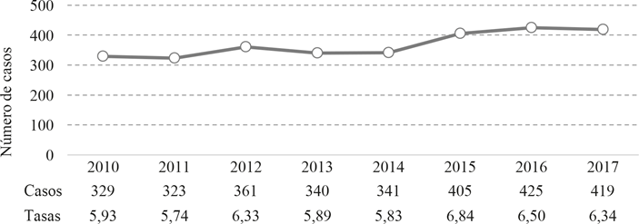 Results: There were 425 suicides in 2016 and 419 in 2017, with a suicides rate of 6.50 and 6.34 per 100,000 inhabitants/year respectively, and 16,446.8 YLL for 2016 and 16,019.94 YLL for 2017. Most of the suicides occurred in males, in young age groups, urban residents and single marital status. Regarding the characteristics of suicide, the most frequently used mechanism was mechanical asphyxia followed by poisoning, in about 40% of cases a triggering life event was established, such as partner conflicts, and were more frequent on Sunday and Monday and at night and early morning.