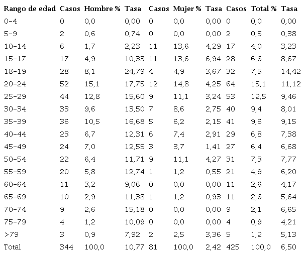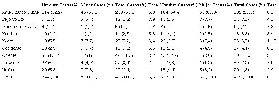 En 2016 el 75,5 % de los casos se presentaron en el área urbana y el 24,5 en la rural; y para el 2017, 77,3 % y 22,7 %, respectivamente. La región con mayor número de casos fue la norte (Tabla 3). Los municipios de esta región que reportaron las tasas más altas en 2016 fueron Campamento (22,1 por 100 000 habitantes/año), San Pedro (11,1 por 100 000 habitantes/año) y Santa Rosa de Osos (11,1 por 100 000 habitantes/año); y en el 2017, Campamento (55,7 por 100 000 habitantes/año), San José de la Montaña (29,4 por 100 000 habitantes/ año) y Santa Rosa de Osos (21,9 por 100 000 habitantes/año). En 2016, el Área Metropolitana fue la segunda región con más casos, principalmente Caldas (12,7 por 100 000 habitantes/año) y La Estrella (11,1 por 100 000 habitantes/año), mientras que en 2017 fue el occidente, específicamente Dabeiba (25,9 por 100 000 habitantes/ año), Caicedo (24,0 por 100 000 habitantes/año) y San Jerónimo (23,4 por 100 000 habitantes/año).