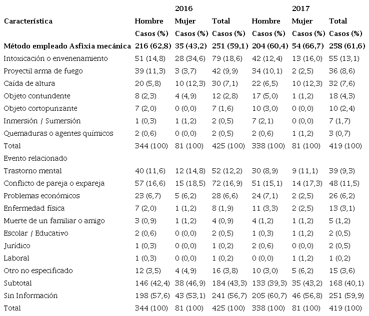 En lo que concierne a las características del suicidio, la mayoría de los casos se produjeron por asfixia mecánica, seguida por envenenamiento. Se estableció que el 43,3 % de los suicidios del 2016 estuvieron relacionados con algún evento desencadenante, mientras en el 2017, lo estuvieron el 40,1 % (Tabla 2). En ambos años, los conflictos de pareja fueron los más frecuentes.