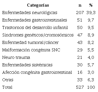 La categoría de enfermedades neurológicas está conformada por entidades neurodegenerativas (demencia tipo Alzheimer, EP, demencia vascular, demencia frontotemporal, demencia por cuerpos de Lewy, demencia mixta, esclerosis lateral amiotrófica) con una frecuencia del 31,9 % (66/207); ECV (incluye isquémica y hemorrágica) con una frecuencia del 28,5 % (59/207); enfermedades motoras no progresivas (incluye parálisis cerebral infantil y encefalopatías hipóxico isquémicas) con una frecuencia del 20,3 % (42/207); otras enfermedades neurológicas (incluye esclerosis múltiple, epilepsia, ataxia cerebelosa, hidrocefalia, kernícterus) con una frecuencia del 12,6 % (26/207); enfermedades neuromusculares con una frecuencia del 4,3 % (9/207) y neuropatías con una frecuencia del 2,4 % (5/207).