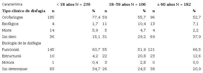Resultados: muestra de 527 pacientes. Distribuidos en menores de 18 años 45,4 % (239/527); 18 a 59: 20,1 % (106/527) y mayores de 60: 34,5 % (182/527). Tipo clínico, etiología y condición de salud más frecuente en toda la muestra: disfagia orofaríngea, etiología funcional y enfermedades neurológicas. Enfermedades más frecuentes causantes de la disfagia en menores de 18 años fueron los trastornos del desarrollo infantil; grupo 18 a 59 años, los tumores/cáncer y en mayores de 60 años, los procesos neurodegenerativos.