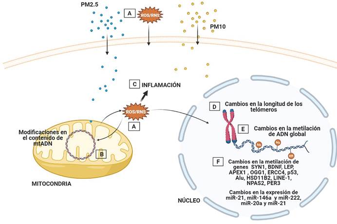 Las mitocondrias contienen múltiples copias de mtDNA para mantener las funciones fisiológicas óptimas (124). El estrés oxidativo generado por PM resulta en una replicación reducida del mtDNA, dando lugar a alteraciones en las funciones bioenergéticas y replicativas de la célula, llevando eventualmente a senescencia celular o apoptosis (125,126). Dado que las mutaciones del mtDNA y sus defectos bioquímicos son acumulativos, su medición proporciona información sobre las exposiciones fetales (126).