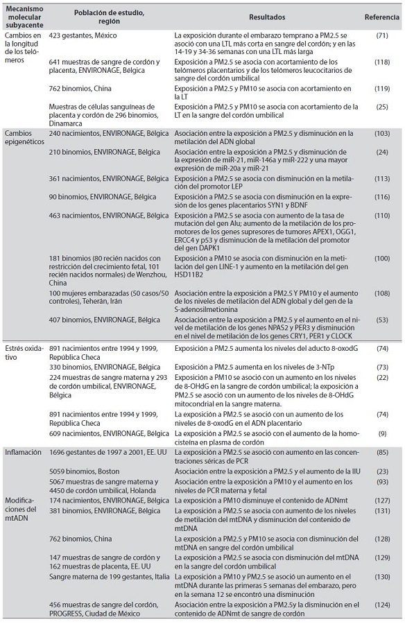 La exposición a PM se ha asociado a cambios en el contenido del mtADN en sangre de cordón umbilical y placentaria; sin embargo, los resultados son todavía inconsistentes (26,127), pues algunos sugieren que la exposición a PM durante el embarazo se asocia con una disminución del mtDNA en la sangre del cordón umbilical; sin embargo, otros sugieren un aumento (124,127-131). Un contenido de mtDNA de sangre del cordón alterado se ha asociado con resultados adversos del embarazo, incluido un crecimiento fetal anormal y BPN (130). Estos resultados se resumen en la Tabla 2.