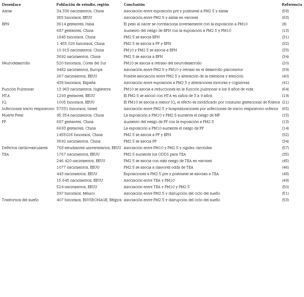 Diferentes estudios epidemiológicos demuestran que el riesgo de PP y BPN aumenta con la concentración de PM y depende del trimestre de exposición. Estudios realizados en China, demuestran que el riesgo de PP y BPN se eleva con un aumento en la concentración de PM2.5 y PM10 durante la gestación (13,31-34). Además del riesgo de PP y BPM, también existe evidencia que sugiere que la mortalidad fetal aumenta con una elevación en 10 μg/m3 de PM2.5 durante todo el embarazo y de PM10 durante el tercer semestre (15). Sin embargo, la mayoría de estos estudios comparan concentraciones ambientales de PM en relación a los entornos de vivienda de las gestantes observadas, sin control de variables que generen influencia en el desenlace de forma independiente o que generen interacciones, esto en detrimento de las predicciones realizadas por dichos modelos; por lo tanto, a pesar de la evidencia, dichas interpretaciones deben ser evaluadas con cautela.