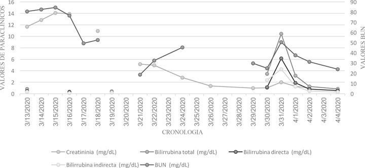 Consulta en el centro de salud local por cuadro clínico, consistente en dolor abdominal localizado en hipogastrio y fosa iliaca derecha, irradiado al dorso, escalofríos, fiebre subjetiva, disuria, orina oscura, hiperoxia, vómito de contenido alimentario y lipotimia con deterioro marcado y progresivo de la función renal por lo que remiten a centro de mayor complejidad. Al ingreso a la institución se encuentra en regulares condiciones con presencia de orina oscura e ictericia. Estudios de imagen confirma cambios de nefropatía aguda, descartando obstrucción de vía urinaria.