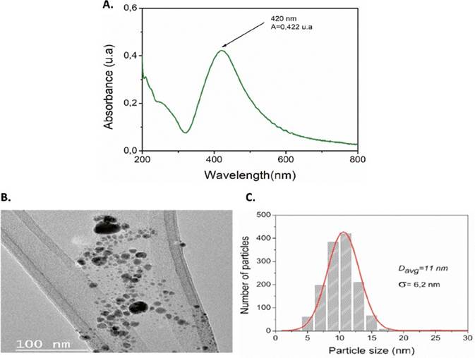 The obtained AgNPs solution was characterized by using ultraviolet-visible spectroscopy (UVVis) and transmission electron microscopy (TEM). UV-Vis was performed in an Orion AquaMate 7100 vis spectrophotometer in a range of 200-800 nm. The size and morphology of AgNPs were determined using a Tecnai F20 Super Twin transmission electron microscope, operating at an accelerating voltage of 200 kV. The average size of the individual particles was measured from TEM micrographs using the freeware ImageJ (20).
