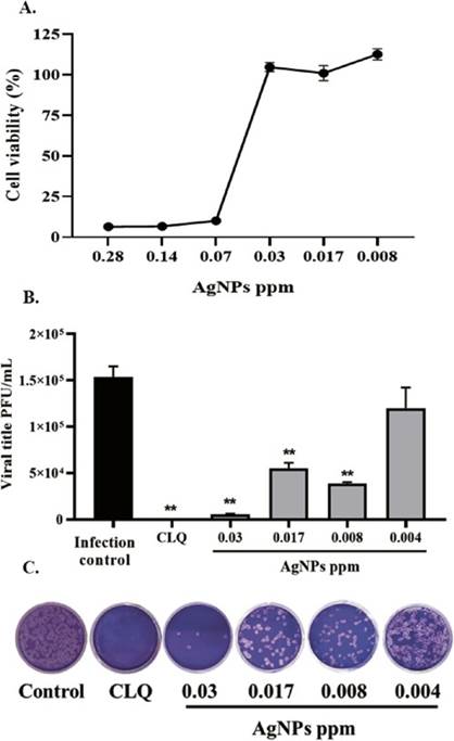 Results: Cytotoxic effect was observed at concentrations above 0.07 ppm. AgNPs exhibit a significant reduction of SARS-CoV-2 viral titer after a prepost treatment strategy with inhibition of 96.5%, 64.13%, and 74.72% at 0.03, 0.017, and 0.008 ppm, respectively.